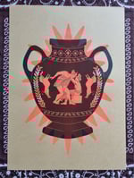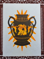 Version one: yellow, pink and black ink on 220gsm speckled and textured off white paper or fluorescent orange and black ink on tan 100gsm paper