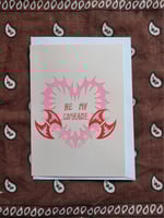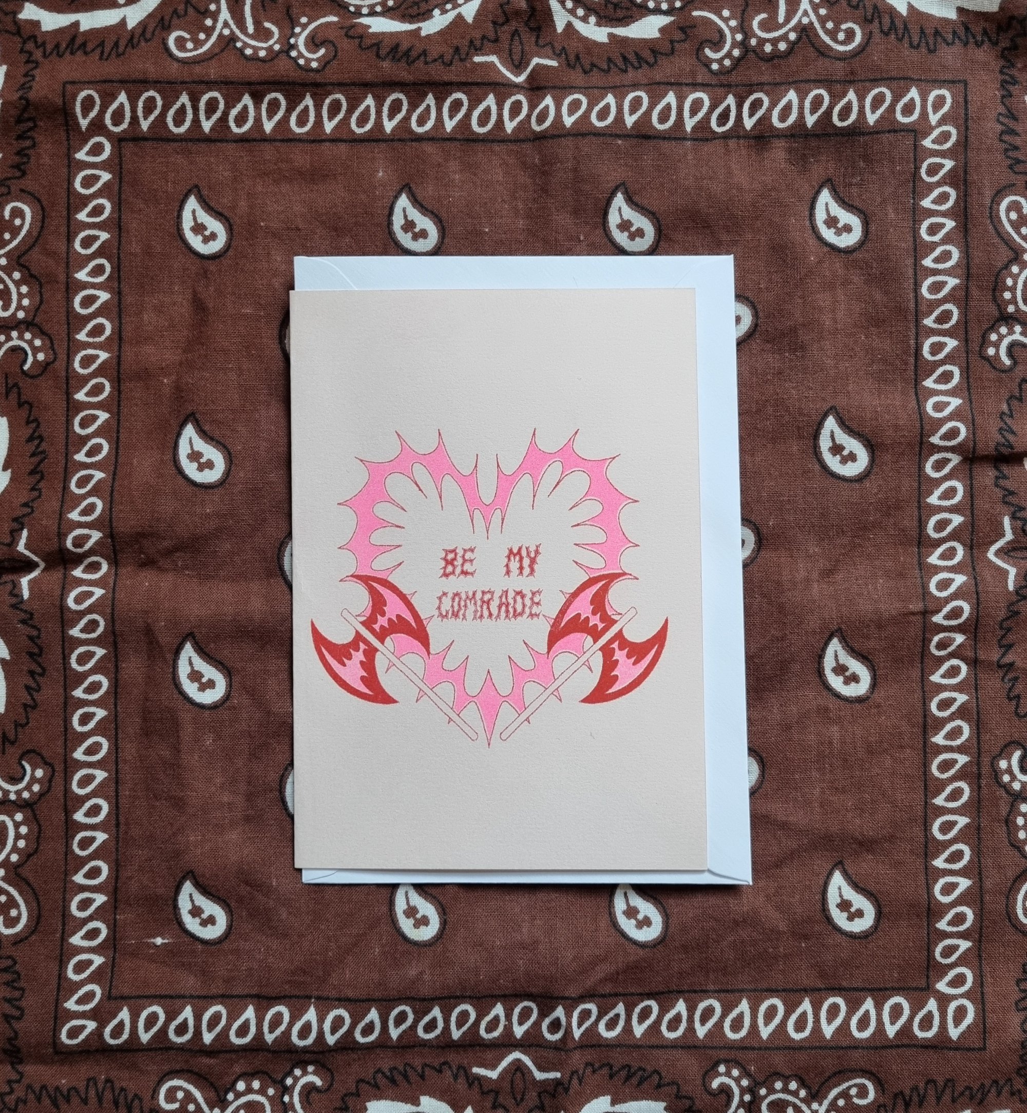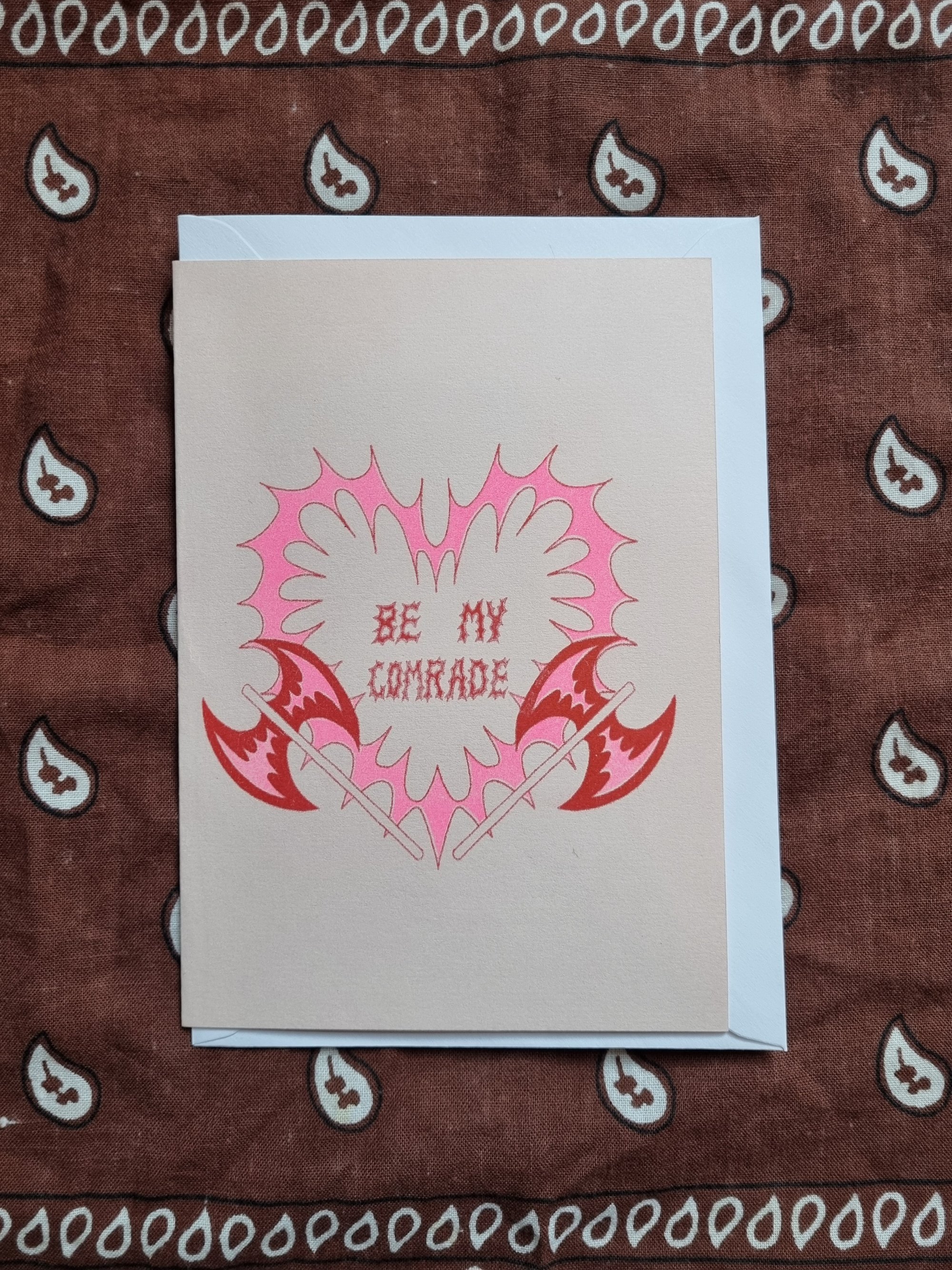 Risograph greeting card, red and pink ink on 120gsm light pink paper