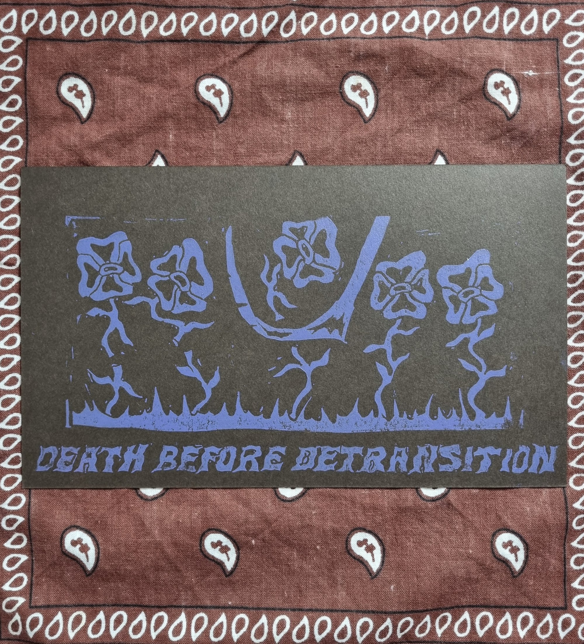 Lino print, purple ink on black paper
